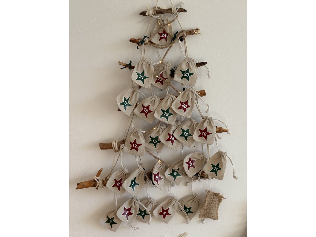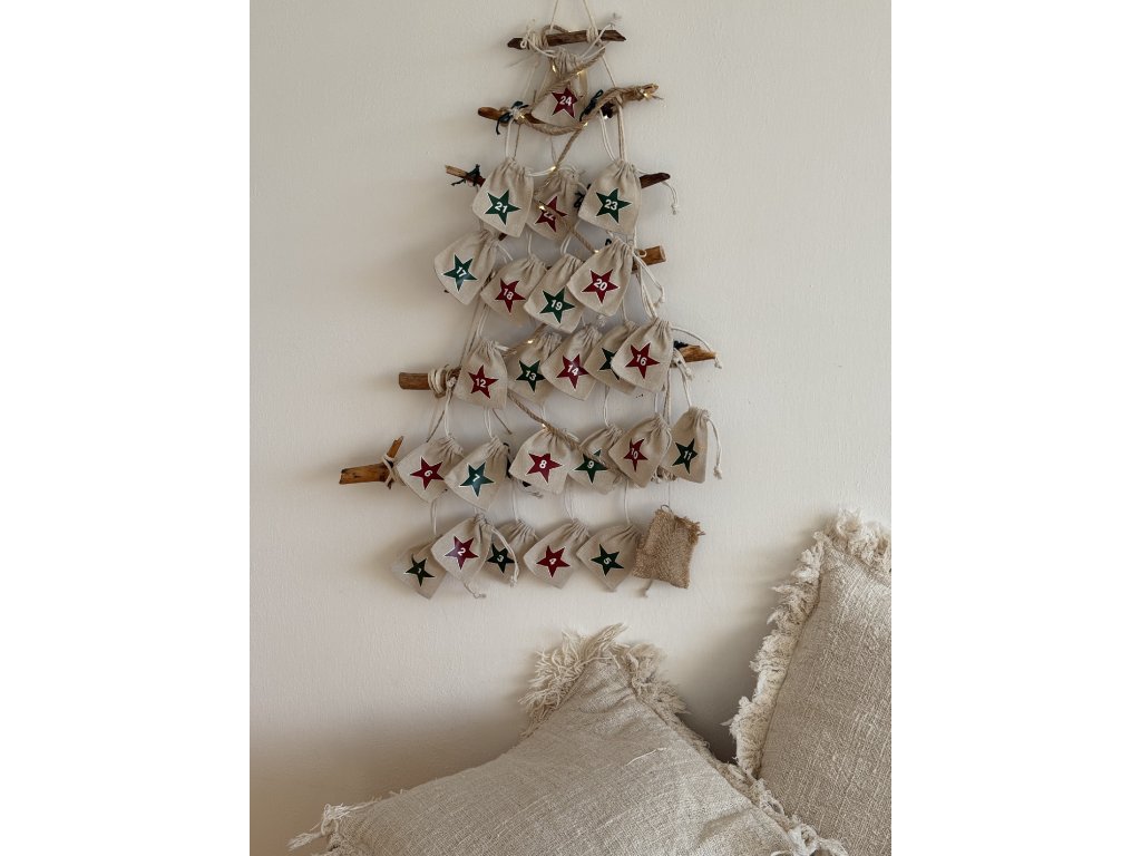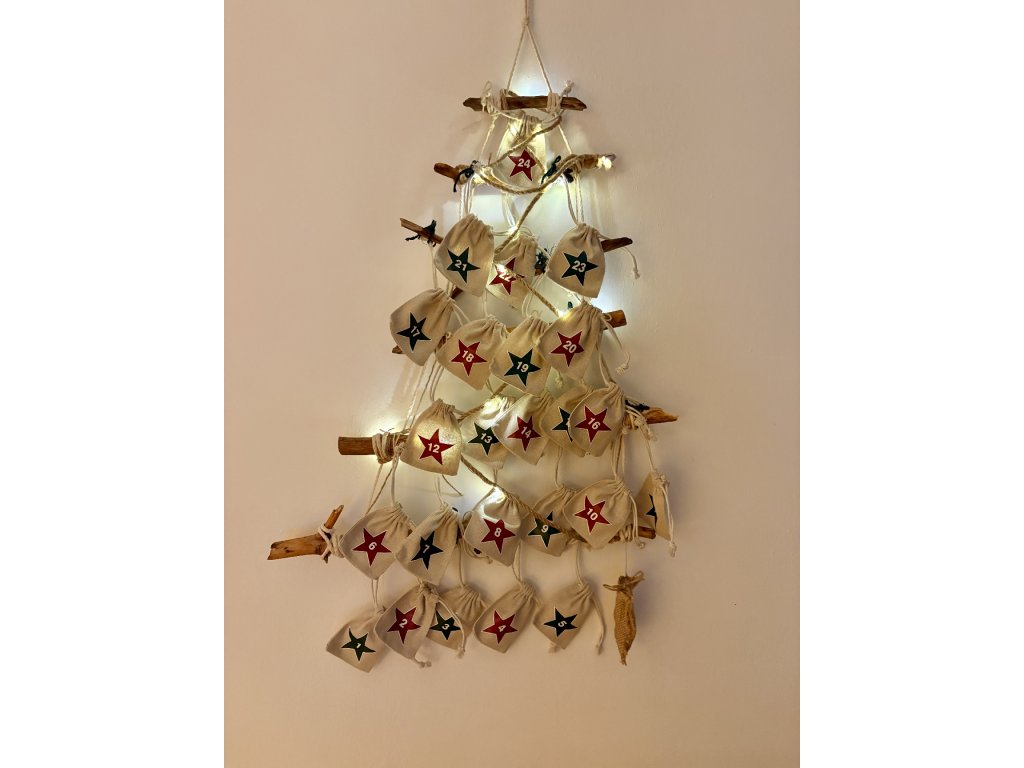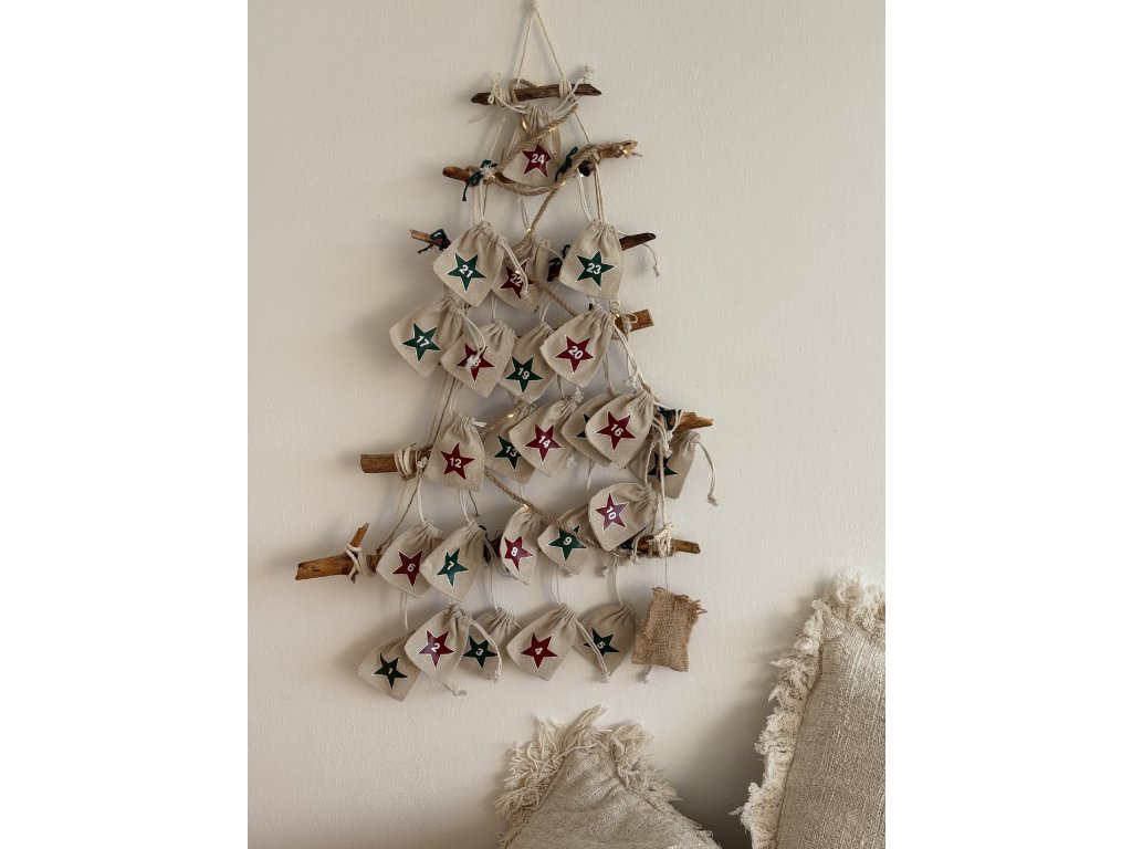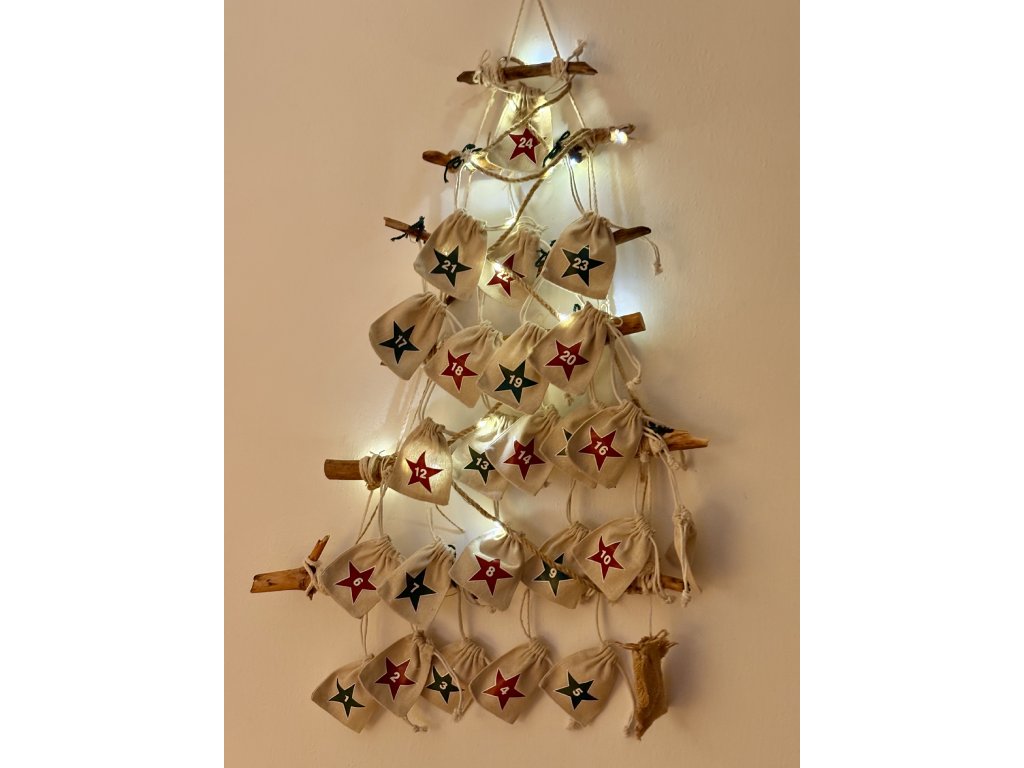 Vytvorte si tú pravú vianočnú atmosféru s týmto ručne vyrábaným Boho adventným kalendárom, ktorý v sebe spája krásu prírodných materiálov a praktickosť. Základ stromčeka tvoria ručne viazané drevené vetvičky , natreté prírodnými olejmi, usporiadané do tvaru vianočného stromčeka. Na ňom sú pripevnené 24ks plátené kapsičky s kvalitného plátna s číslami od 1 do 24 – ideálne na drobné prekvapenia pre každý deň adventu.