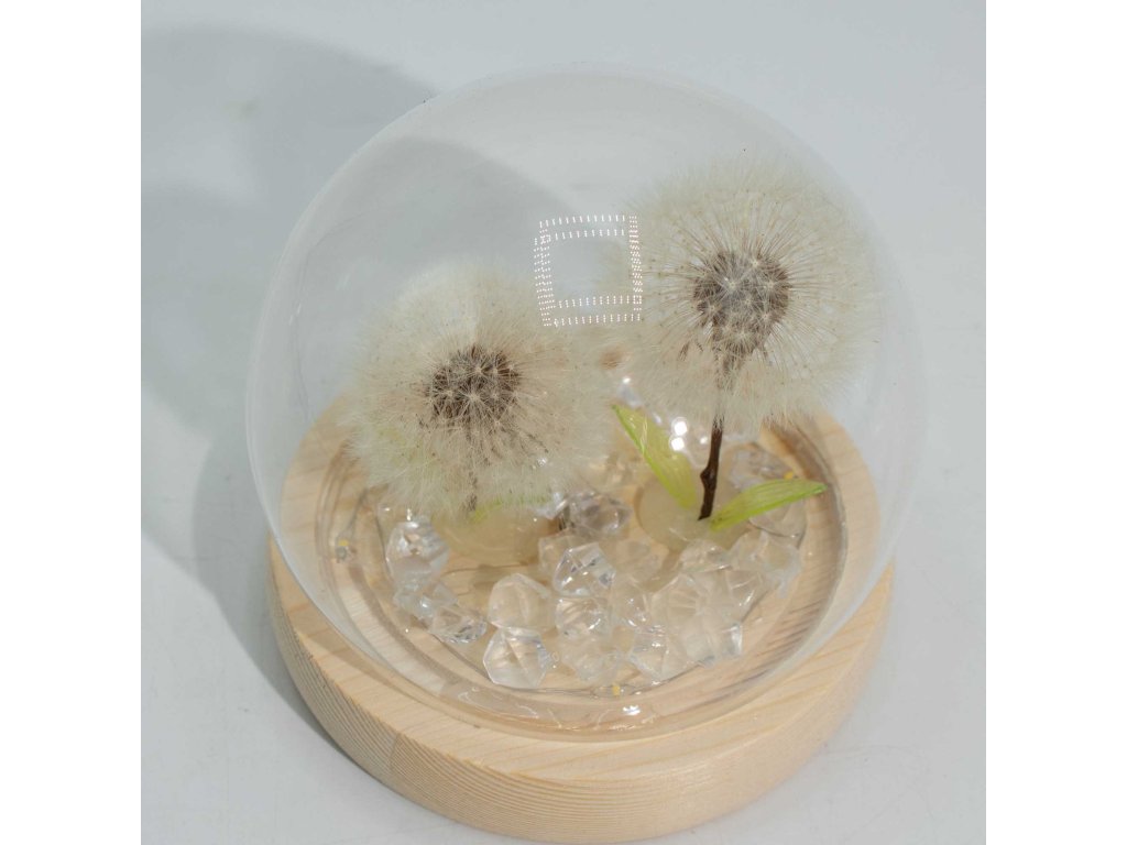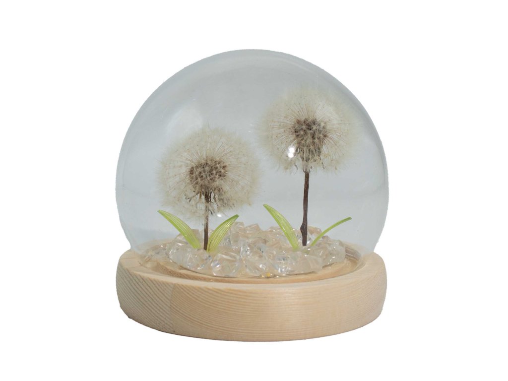 Sklenená LED dekorácia Púpavy prináša do interiéru pokoj, jemnosť a svetlo. Dve vzdušné hlavičky púpav sú umiestnené pod čírou sklenenou kupolou, kde mäkké LED osvetlenie vytvára tichú atmosféru a jemnú hru tieňov.