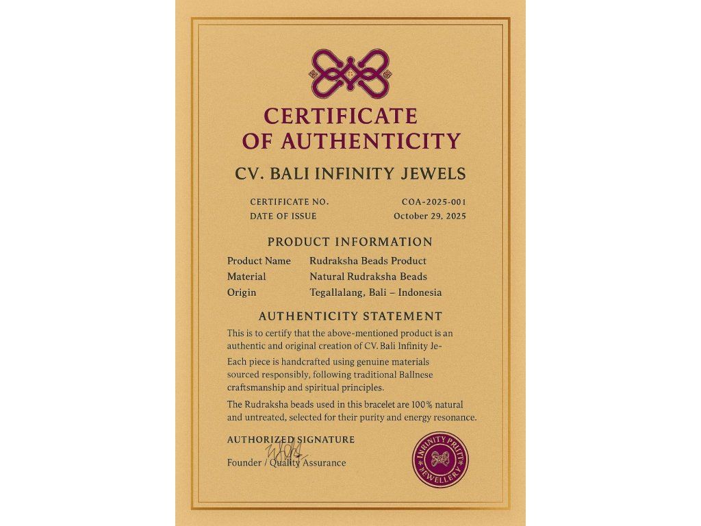 Táto originálna Bali Mala je ručne vytvorená z autentických korálok Rudraksha, ktoré sú po stáročia uctievané ako duchovné klenoty. Tradícia hovorí, že vznikli zo sĺz boha Šivu a ich sila spočíva v podpore vnútornej premeny, pokoja a odvahy.
