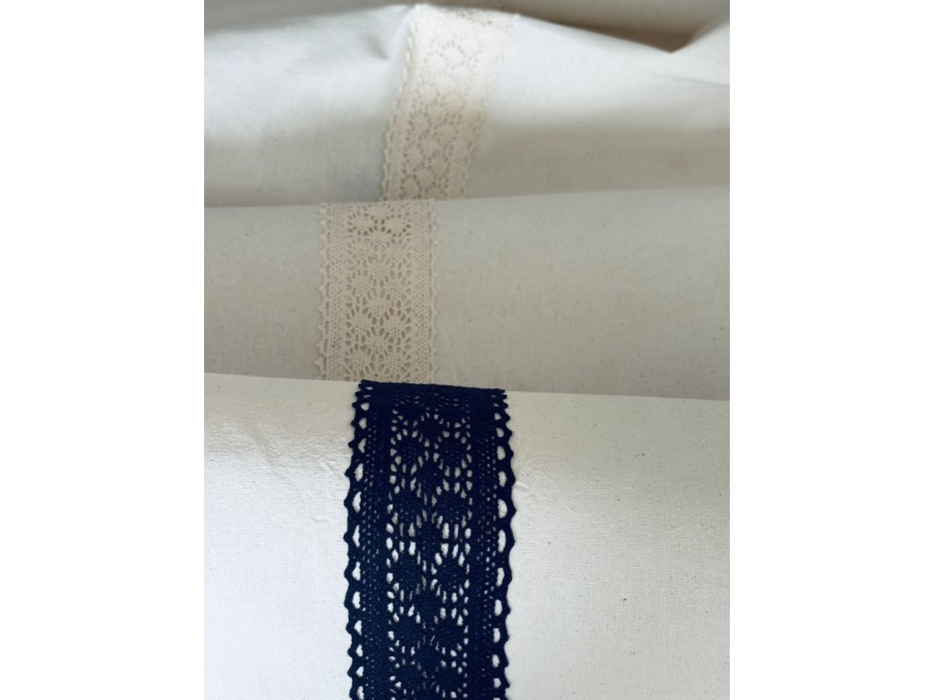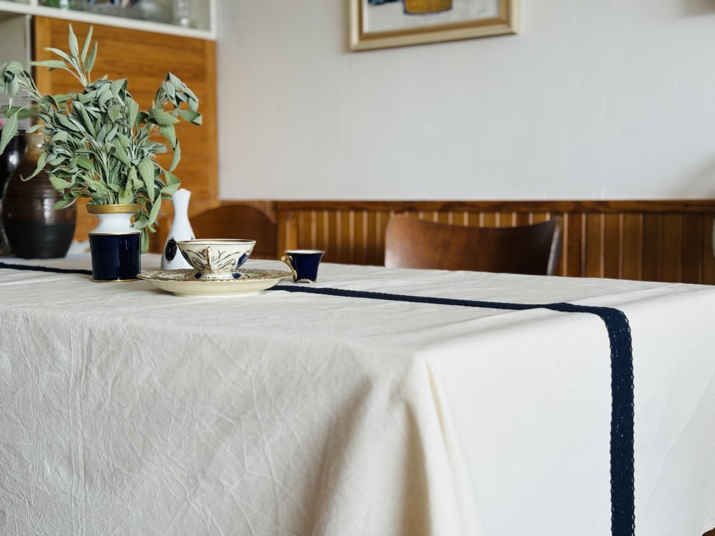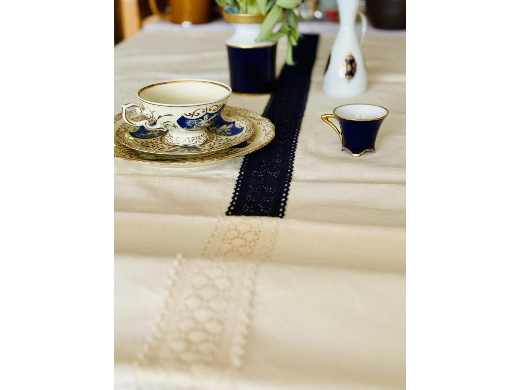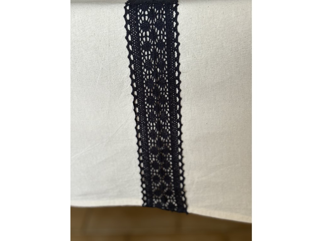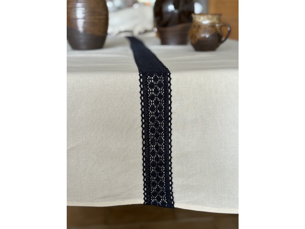 Bohostyle handmade obrus z ražnej bavlny a ľanu s krajkou Ručne šitý obrus – Boho štýl, ražná bavlna, tmavomodrá krajka