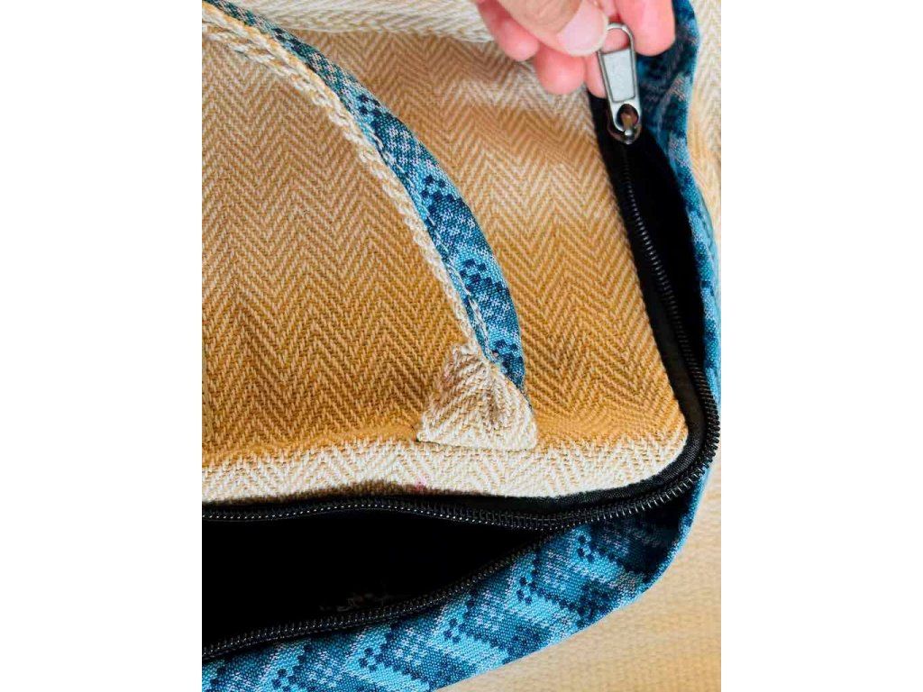 - Farba: prírodná béžová a modrý Dhaka dizajn- ide o tradičný, ručne tkaný vzor, ktorý pochádza z južnej Ázie, hlavne z Nepálu