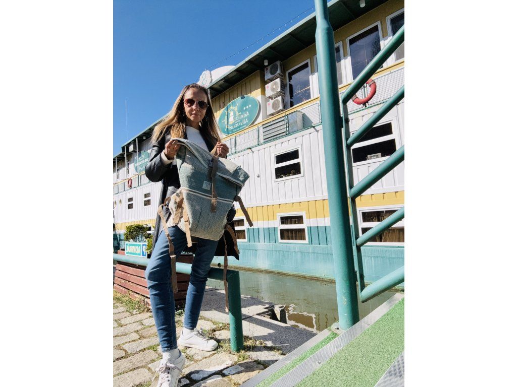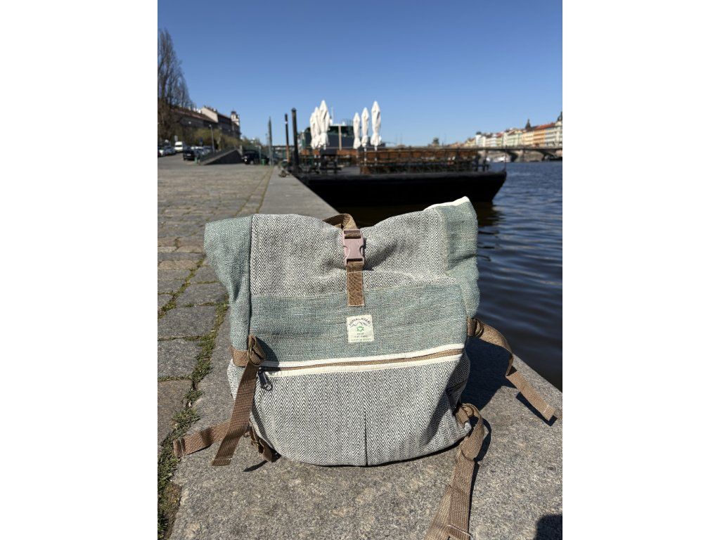 Rolovací konopný batoh v jemnej farbe šalvia vyrobený v Nepále. Ekologický, odolný a praktický batoh vhodný na turistiku, cestovanie aj každodenné nosenie. Rozmery: 53 × 31 ×...