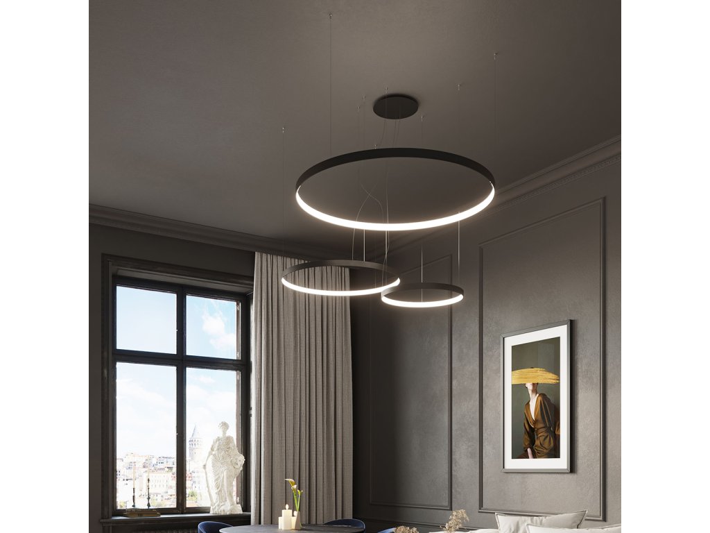 RIO zaujme svojou všestrannosťou. Luster (jednoduchý, dvojitý alebo trojitý) a stropné svietidlo sú jeho bežnou verziou. Umeleckou variáciou na tému RIO je vertikálne závesné svietidlo, ktoré poskytuje nekonečné možnosti usporiadania tak v súkromí, ako aj v hale, obývačke, šatni, kúpeľni, ale aj v elegantných verejných priestoroch, ako sú: wellness centrum, SPA salón, galéria, butik, reštaurácia, kancelária . Moderné minimalistické LED kruhy zaručujú vysokú estetiku a svetelné parametre (3000K CRI 90, 4000K CRI 95) Vysoký svetelný tok v kombinácii so svetelným zdrojom LED). Estetický vzhľad svietidla zaručujú aj rozmery profilu: výška 40 mm, šírka 8 mm. Rovnako ako všetky naše svietidlá sa aj krúžky vyrábajú výhradne v Poľsku. Preto môžeme svojim zákazníkom zaručiť rýchlu realizáciu objednávky.Dodatočné parametre