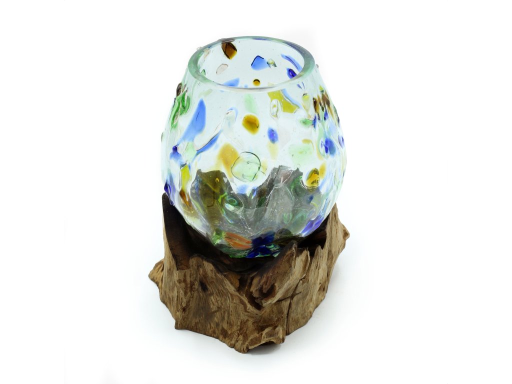 Fúkané sklo na kúsku dreva je výnimočný dizajnový prvok, ktorý vzniká tradičnou ručnou výrobou na Bali. Horúce, ručne fúkané farebné sklo sa priamo priloží na prírodný koreň dreva Gamal, kde sa prirodzene usadí a vytvaruje podľa jeho štruktúry. Po vychladnutí vznikne dokonalé spojenie – každá miska je neopakovateľný originál.